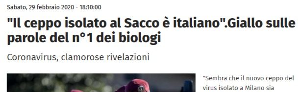 Riprendiamo un intervento di ieri di Dagospia, secondo cui Vincenzo D’Anna, presidente dell’Ordine Italiano dei biologi ha affermato che il virus reperito ed analizzato in Lombardia embrerebbe NON aver nulla a che spartire con quello cinese; anzi sembrerebbe un virus “para-influenzale“, addirittura endemico, DIVERSO da quello diciamo cinese e anche nazionale, che infatti NON emerge altrove in Italia. Che tale affermazione sia non inventata è confermato indirettamente dal quotidiano online milanese Il Sussidiario, vicino a Comunione e Liberazione, ossia vicino al cuore del potere lombardo, che però cerca nel mentre di versare acqua sul fuoco.