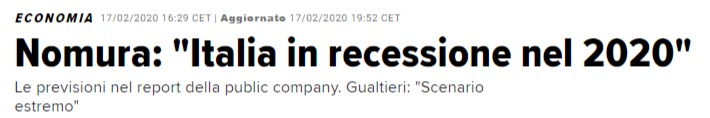Sappiate solo che, arrivando alle notizie veramente brutte per il benessere sociale italiano, come spero abbiate capito da qui a qualche mese l’Italia sprofonderà in recessione; dunque, la stessa EU che qualcuno vuole ormai “cambiare dal di dentro” a richieste di flessibilità di Roma post recessione concausata dal virus per 50 o 100 miliardi di euro – questa sarà la cifra necessaria -, risponderà che può concedere solo, che so, circa 5 mld di euro. Dunque, a breve la scelta sarà tra morire di austerità o uscire dall’euro. Mi chiedo dunque perchè non cavalcare la tigre già da ora. Chiaramente non parlo alla sinistra, che prospera grazie all’EU, ma ai post sovranisti, gli stessi che dai tempi di Savona di fatto sostituito con il mitico Armando Siri, e della TAV votata addirittura col PD e con Forza Italia, di fatto sono mutati come un virus nella contrarietà all’ITALEXIT.