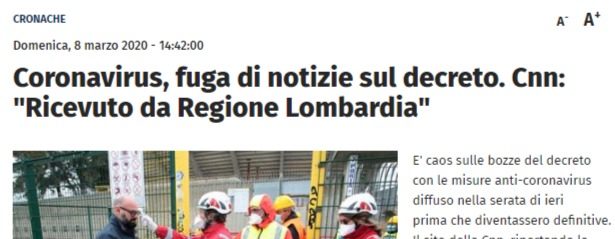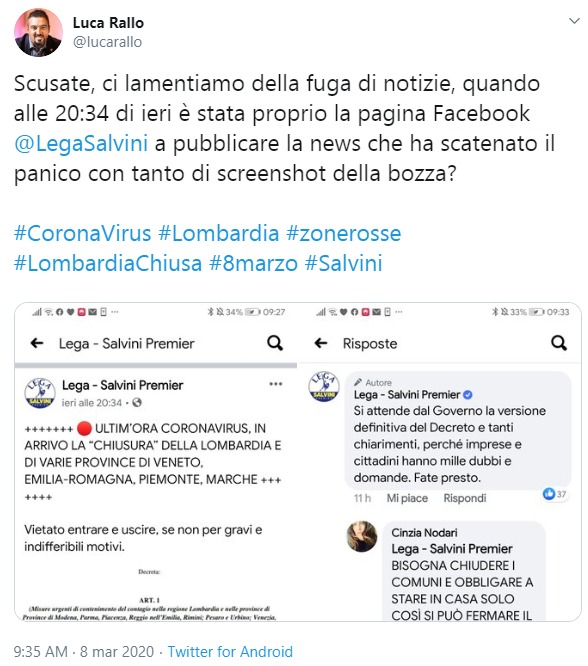 Le notizie arrivano, frammentarie. E sono clamorose: da una parte si dice di voler evitare il panico, invece i fatti ci dicono che c’è qualcuno che il panico lo diffonde, sembrerebbe volutamente a questo punto. E, udite bene, chi lo diffonde è proprio la Regione Lombardia, governata dal leghista Fontana. Addirittura dall’ufficio Stampa della Regione!! A che gioco si gioca? Per lo sfascio? Si vuole davvero separare l’Italia facendo prima scappare i “meridionali”, tornati al sud? Follia pura, totale follia. A questo punto si possono azzardare anche tesi “pesanti”…