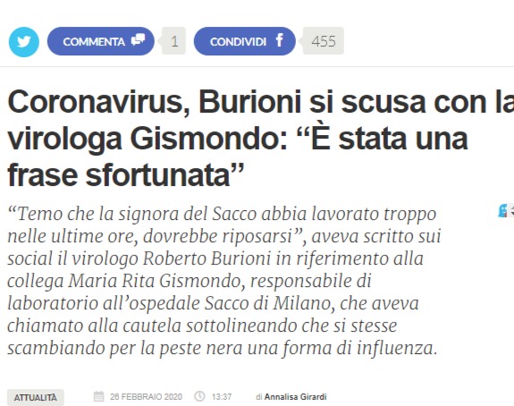 Ma la notizia più importante è certamente un’altra: la dottoressa Gismondo dell’Ospedale Sacco, entrata in polemica con l’incendiario Burioni, quella che aveva paventato l’esistenza di due ceppi di Covid-19 – di cui una quasi innocua viste le condizioni di Zingaretti, asintomatico – ha affermato che il virus era probabilmente già presente a partire dallo scorso novembre, di fatto contemporaneamente alla Cina, quasi il contagio fosse avvenuto nei due paesi, Cina ed Italia, allo stesso tempo. Questo è sia un bene che un male, nel senso che se non c’è stata una vera epidemia fino ad ora la cosa potrebbe non essere così seria.
