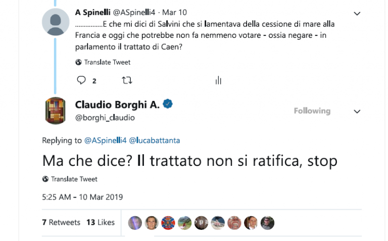 Fattuale: chi attacca la Francia “dove fa male” è il M5S. La Lega NO, anzi è proTAV. Perchè Salvini, invece di far parole, non manda in aula la legge di ratifica del Trattato di Cessione di mare alla Francia (Caen)?