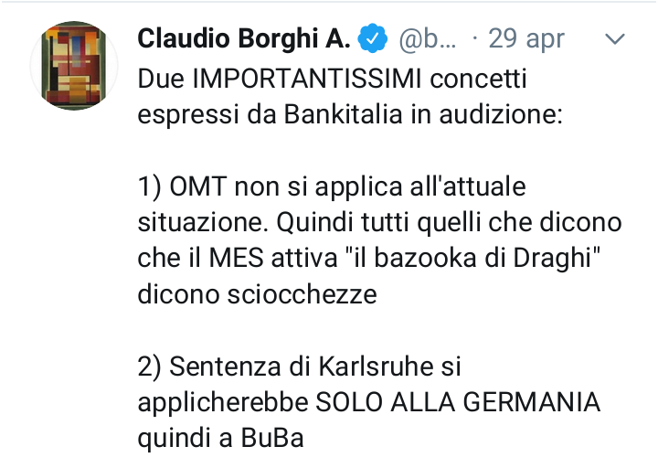 Tradotto: se richiedere l’assistenza del MES per le spese sanitarie è una follia, perché il MES senza condizioni e senza sorveglianza rafforzata ex Art. 136.3 TFUE non esiste (un prestito del MES, secondo i trattati dell’EU, prima o poi comporta una valutazione della sostenibilità del debito pubblico e quindi per l’italia la sua ristrutturazione od una maxi-imposta patrimoniale)…richiedere il MES credendo che si attivino le OMT, come abbiamo sentito dire perfino da Messina CEO di Intesa San Paolo, oltre che dal tristissimo cavanserraglio piddino…è semplicemente impossibile: