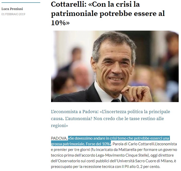 Sotto, vi riproponiamo un pezzo scritto nel lontano febbraio 2019, ma tremendamente attuale. In realtà sono stati scritti svariati pezzi sullo stesso argomento (LINK, LINK, LINK, LINK,…) in cui si è esplicitato senza se e senza ma che l’alternativa oggi è, o ITALEXIT o la mega patrimoniale pagata da chi ha qualcosa ma non nulla, esentando le elites. In particolare va ricordata la deriva successiva, quella relativamente recente, ad es. il Decreto Rilancio, art. 134, in cui viene permessa una prepotente e oltremodo semplice elusione fiscale per i grandi patrimoni superiori ai 7 milioni di euro, nel totale silenzio dell’Opposizione, chiaramente d’accordo per far passare tale legge truffa tacendola al popolo bue.