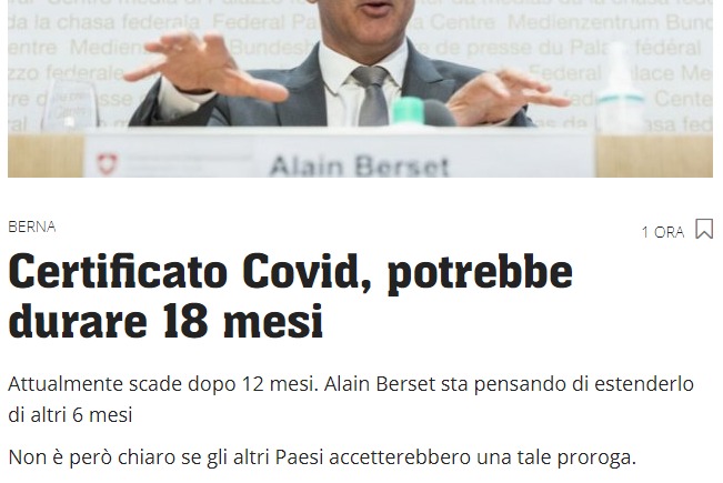 Mentre l’Italia vuole la terza dose anche per i vaccinati da circa 6 mesi, la Svizzera pensa alla proroga di 12 mesi, con una durata totale del Pass a 18 mesi. Visto che l’OMS sta in Svizzera, sono certo che a Berna sanno precisamente cosa fare.