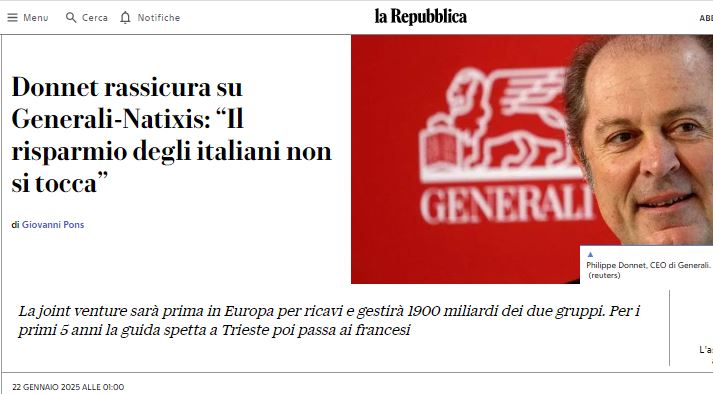 Forse, a conferma del fatto che effettivamente si tratti – per Generali-Natixis – di un vero e proprio scippo, c’è stata la dichiarazione ufficiale “non richiesta” di Donnet, AD francese di Assicurazioni Generali (memento il francese Mustier per Unicredit ai tempi della vendita di Pioneer), che nella più classica “excusatio non petita, accusatio manifesta” ha annunciato urbi et orbi encore “guarda caso” sui media italiani vicini a Davos che il risparmio degli italiani non si tocca. Così almeno ci sembra di intendere, l’AD francese di Generali implica che comunque non si tratta di scippo francese (…).