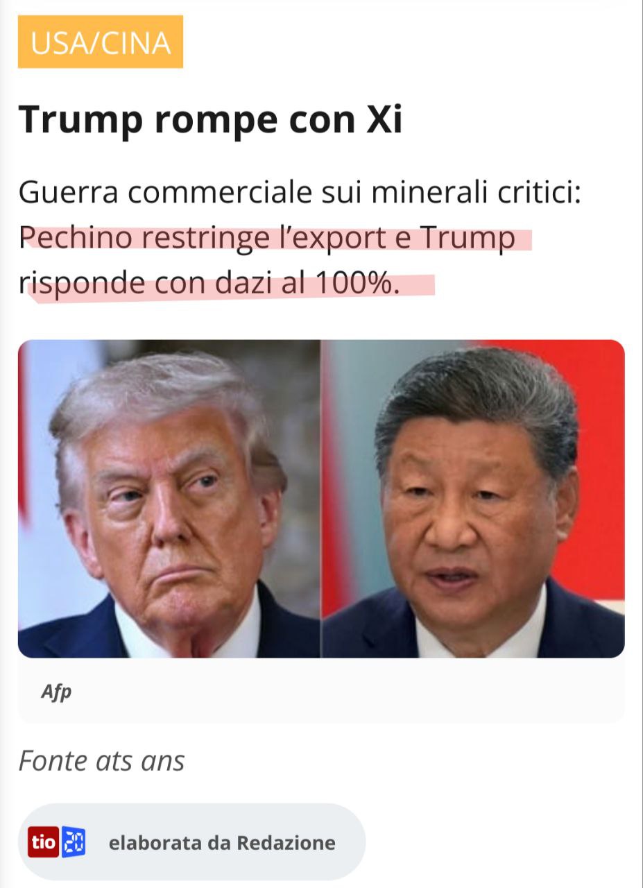 Dunque, abbiamo tutti visto dipingere Trump come una sorta di pazzo negli scorsi giorni, dai giornali di Davos. Per aver aumentato i dazi alla Cina del 100%, apparentemente senza motivo. Decisione trumpiana annunciata, con decorrenza 1. Novembre 2025, di venerdì notte scorso, alle 23:01.