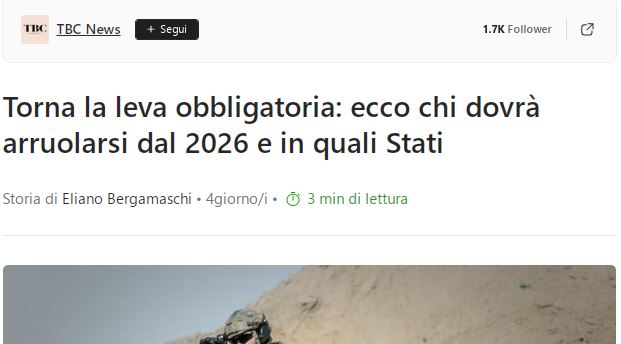 In parallelo – notate bene – anche in Italia ma non solo, in tutta Europa, è partita prepotente la spinta per mandare di nuovi i giovani – e anche le giovani – a “fare il militare“, la leva obbligatoria: hanno bisogno di carne da macello nel caso Davos non venga affossata (dagli USA, vedasi di seguito).