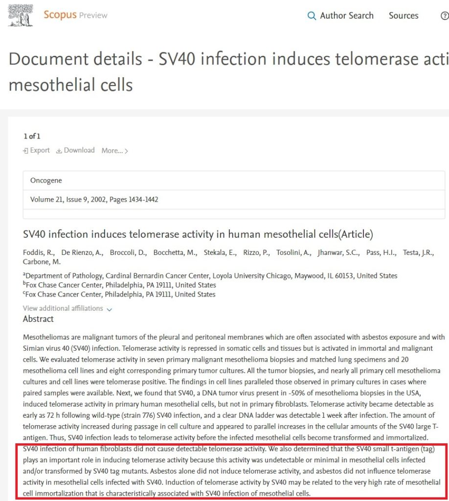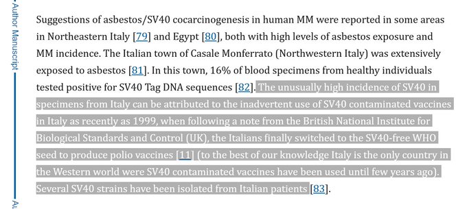 Impressionante rilevare che i maggiori esperti in materia confermano che l’asbesto da solo non causa il mesotelioma, che viene ingenerato solo via bi-fattoriale [asbesto-infezione da virus SV40[ (fa paura pensare che fino al 1999i vaccini antipolio in Italia fossero infettati da tale virus oncogenico; oggi scopriamo che pure i preparati mRNA COVID sono stati contaminati anche loro dal virus SV40, dopo tanti anni succede di nuovo, sebbene questa volta da frammenti di tale virus oncogenico)