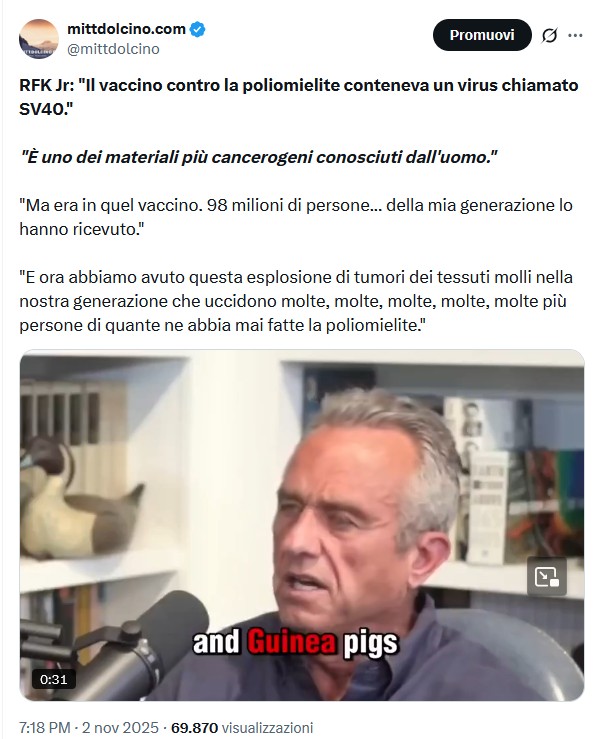 Si, avete capito: RFK jr., oggi ministro della salute degli Stati Uniti d’America, ha spiegato alla gente che l’uso di tali preparati, a causa di una mancata purificazione dai frammenti del virus SV40 usati nella sua manifattura, può portare con non insignificante probabilità a contrarre forme mortali di cancro!