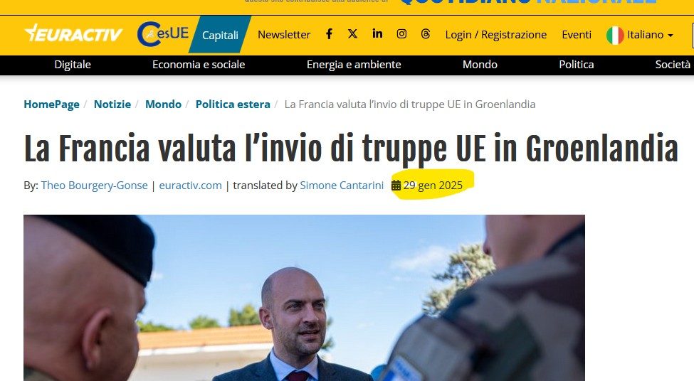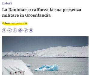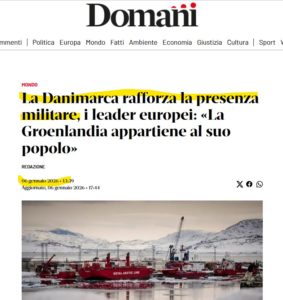Dunque, complice la propaganda dei media di Davos sulla Groenlandia, dove Trump semplicemente ha detto che vuole fare un accordo con gli Inuit locali (gli USA sono pronti a fare ricchi gli Inuit, oggetto invece di colonizzazione imperante e violenta da parte danese, da secoli) mentre invece la prima risposta dell’EU è stata quella di mandare l’esercito in loco, pensate voi, vedasi oltre, è chiaro che sui media si è fatto di tutto per confondere le acque.