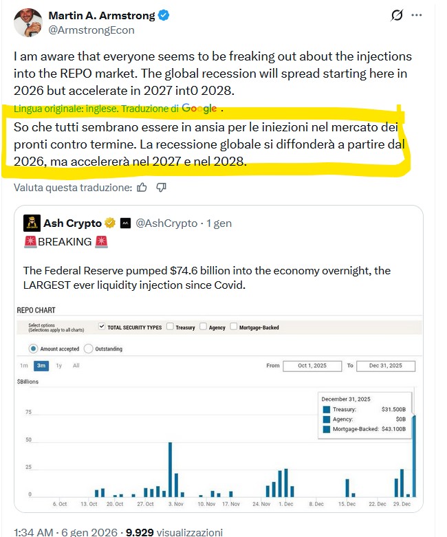 Se volete delle date, Martin Armstrong ieri ci ha dato una indicazione preziosa: secondo l’importante analista USA la recessione inizierà a fine 2026 e sarà forte nel 2027 e 2028. Ovvero prima del 2030, data del “non avrete niente e sarete felici” di Davos: quale miglior momento per scatenare una guerra contro la Russia, a cui dare la colpa di tutti i disastri europei?