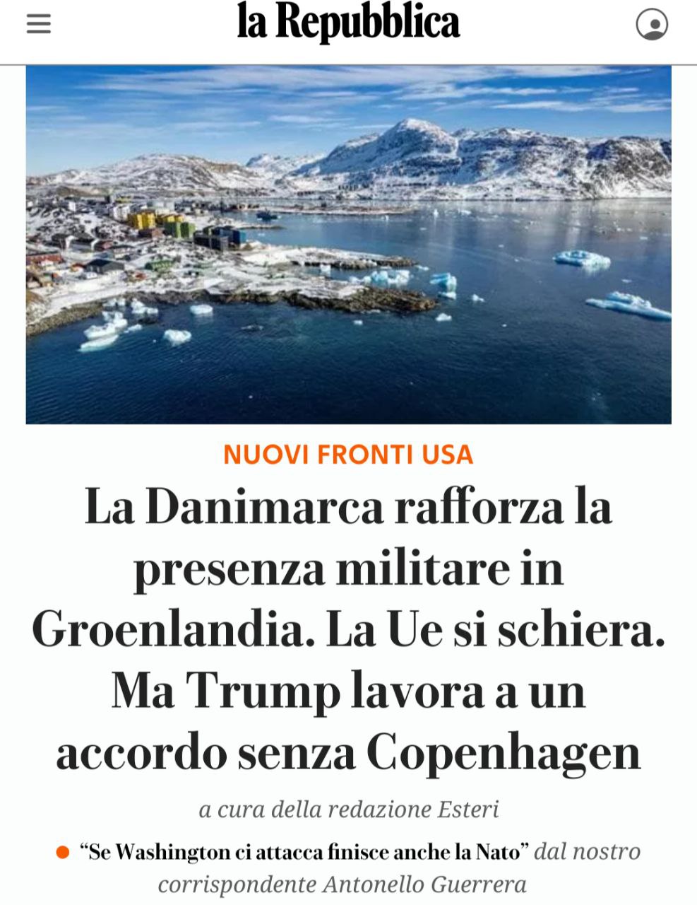 Dunque, stante quanto sopra, il primo titolo di Repubblica sull’argomento diceva tutto, lo citiamo, almeno capite: in soldoni, diceva che gli USA vogliono fare un accordo coi locali (e implicava che gli stessi States sapevano di avere ottime carte, o meglio i danesi hanno pessime carte in mano visto il loro passato coloniale, vedasi oltre); mentre gli EUropei mandano l’esercito in loco per impedirlo (ben rappresentando quanto emerso soprattutto lato Copenaghen e pure lato Parigi, vedasi oltre, la loro volontà coloniale)