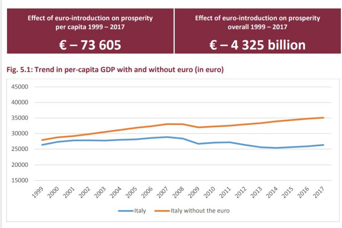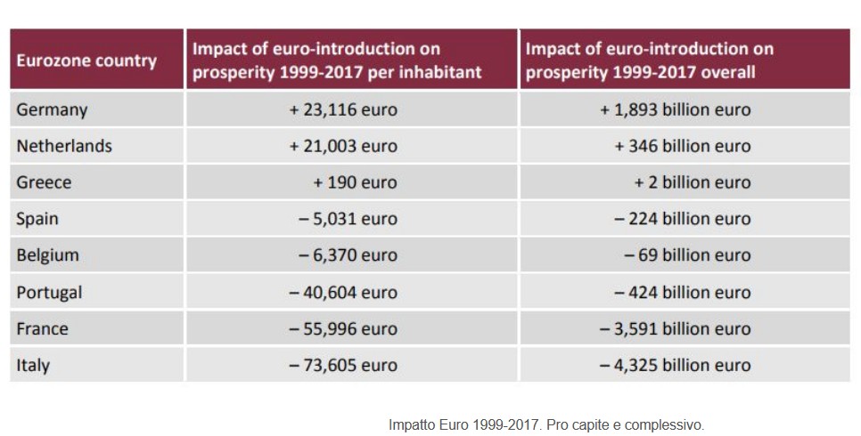 IL CEP, Centre for European Policy Network, nella sua analisi del 2019, giunse alla conclusione che la Germania ha guadagnato più di tutti dall’introduzione dell’euro: quasi € 1,9 trilioni tra il 1999 e il 2017. Questo ammonta a circa € 23.000 per abitante. In caso contrario, solo i Paesi Bassi hanno ottenuto notevoli benefici dall’introduzione dell’euro. Nella maggior parte degli altri paesi analizzati, l’euro ha comportato un calo della prosperità: in Italia, questo ammontava nello studio citato a € 74.000.