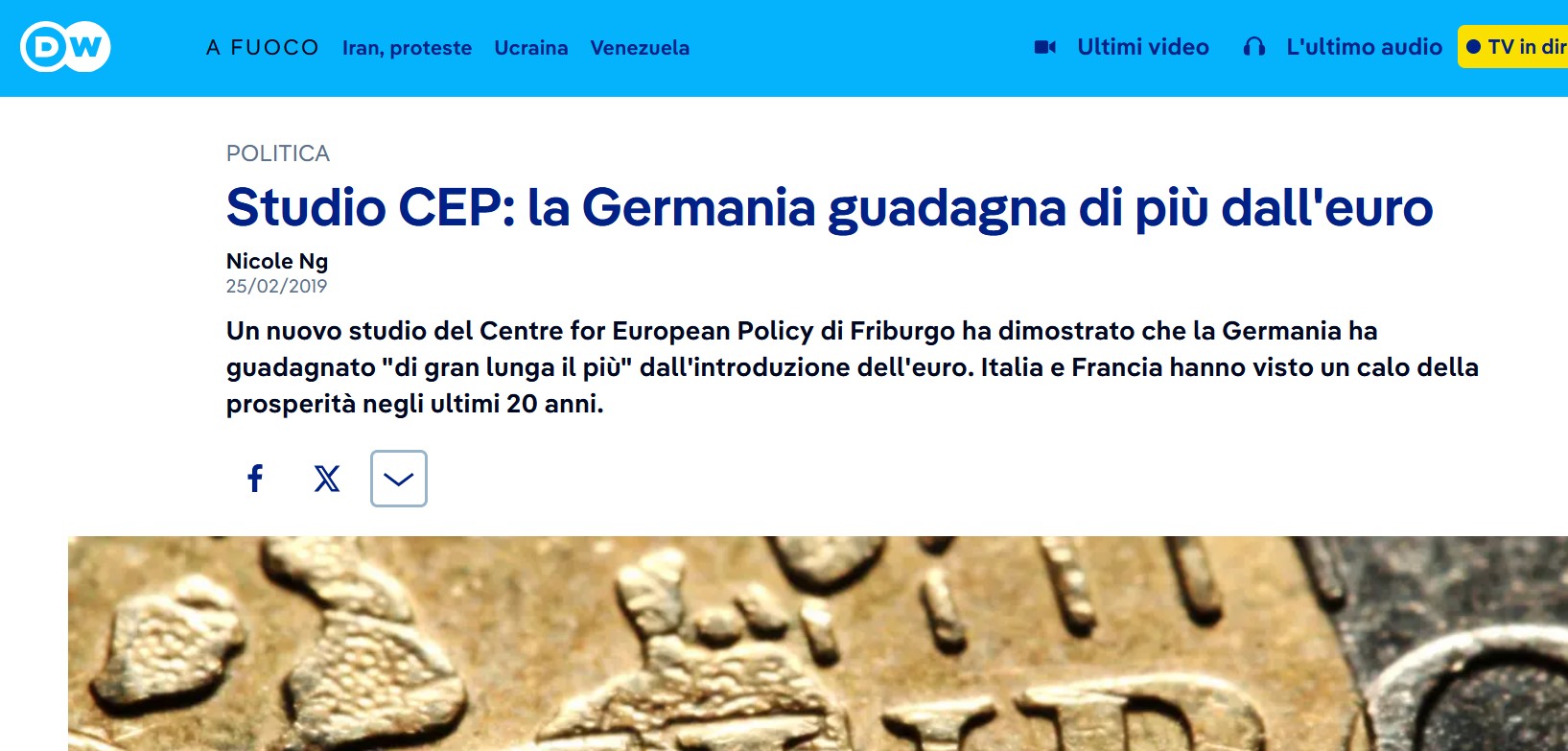 Lo studio sopra citato del CEP per altro fece molta eco anche in Germania: peccato di lì a poco sia stato sommerso dalla valanga del COVID, di fatto sterilizzando ogni levata di scudi contro la moneta unica, vedasi sotto il commento del canale tedesco di Stato DW.