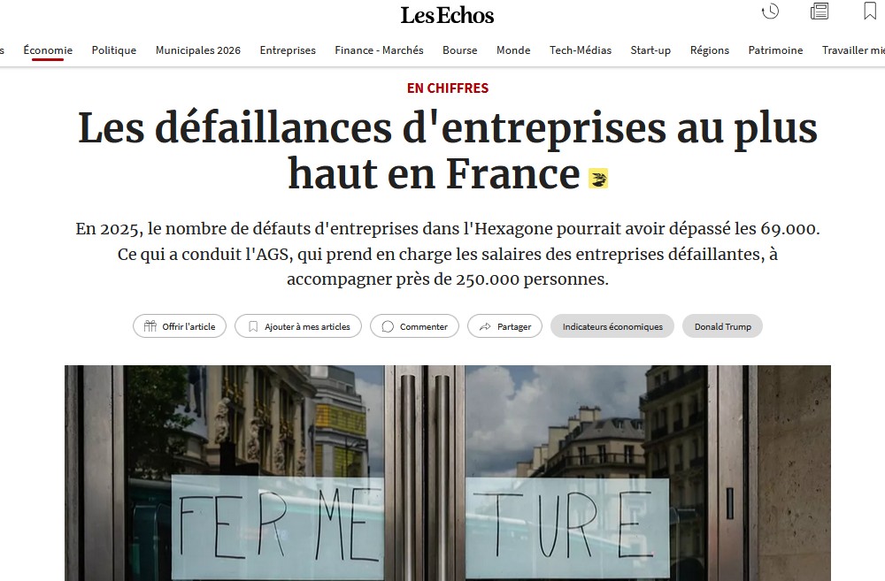 Oggi la Francia sta saltando: le Echos, sopra, principale giornale finanziario francese, spiega nei dettagli che le PMI francesi nel 2025 hanno raggiunto il massimo livello di insolvenza storico, è record.