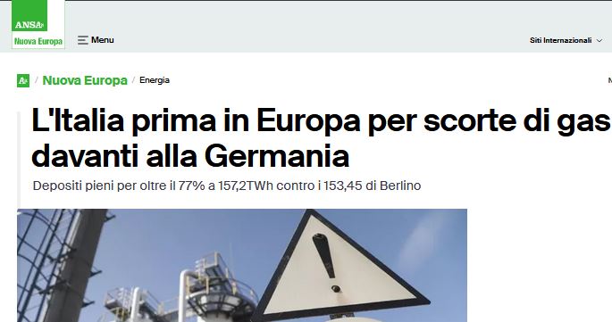 A guardare gli stoccaggi gas Europei si capisce che l’Italia, che ha riempito a dovere i suoi stoccaggi gas l’anno scorso, sta salvando l’EUropa dal lockdown energetico. Infatti la Germania, come abbiamo scritto tempo fa (al LINK), non avendo riempito a dovere le sue riserve gas precisamente come fece nel 2021, stava innescando di nuovo una carenza sistemica di gas in EU. Che avrebbe portato a emergenze varie, ad esempio a dichiarare emergenze vere, di guerra, come ad esempio dire al popolo che era in pericolo, in modo da fargli accettare qualsiasi misura, anche draconiana (…).