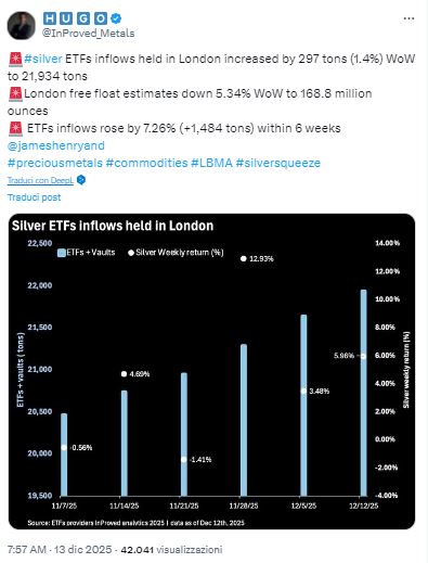 Sembra per altro logico che la manipolazione di cui sopra sia stata perpetrata dalla Cina con l’ausilio degli stakeholders londinesi, salvando così – solo alcuni giorni dopo la visita di Sir Starmer a Pechino, che caso – la borsa LBMA che sembra avevesse finito il metallo; mentre oggi una valanga argento sta arrivando dagli USA come risultato di detta manipolazione, bene Trump prenda nota (vedasi immagine sopra).