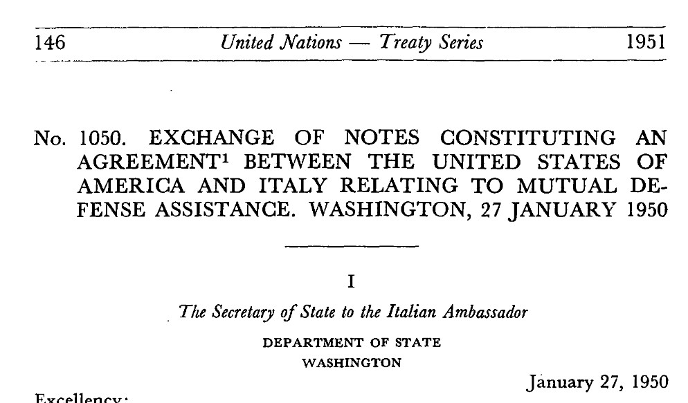 “Exchange of notes constituting an agreement relating to mutual defense assistance”, Italy-USA. Washington, 27 January 1950