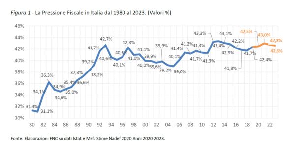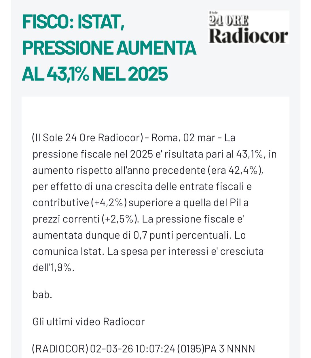Questa notizia ci porta alla seconda constatazione della stampa questa settimana, su base dati reali: il governo Meloni nel 2025 ha raggiunto la pressione fiscale del 43,1%, un soffio dal 43,3-43,4% dell’era Monti, vi ricordate? “Abbiamo distrutto la domanda interna” alla CNN, i sorrisini di Merklel e Sarkozy, le manovre lacrime e sangue…