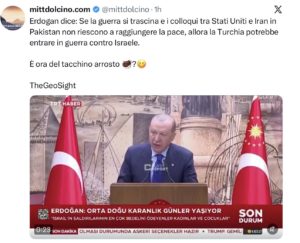 In parallelo Erdogan, paese con l’esercito più grande del mediterraneo e dell’Europa allargata, medio Oriente incluso, dichiara bellamente di essere prossimo a dichiarare guerra ad Israele.