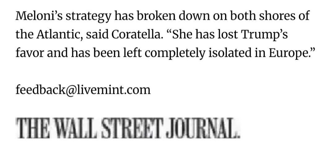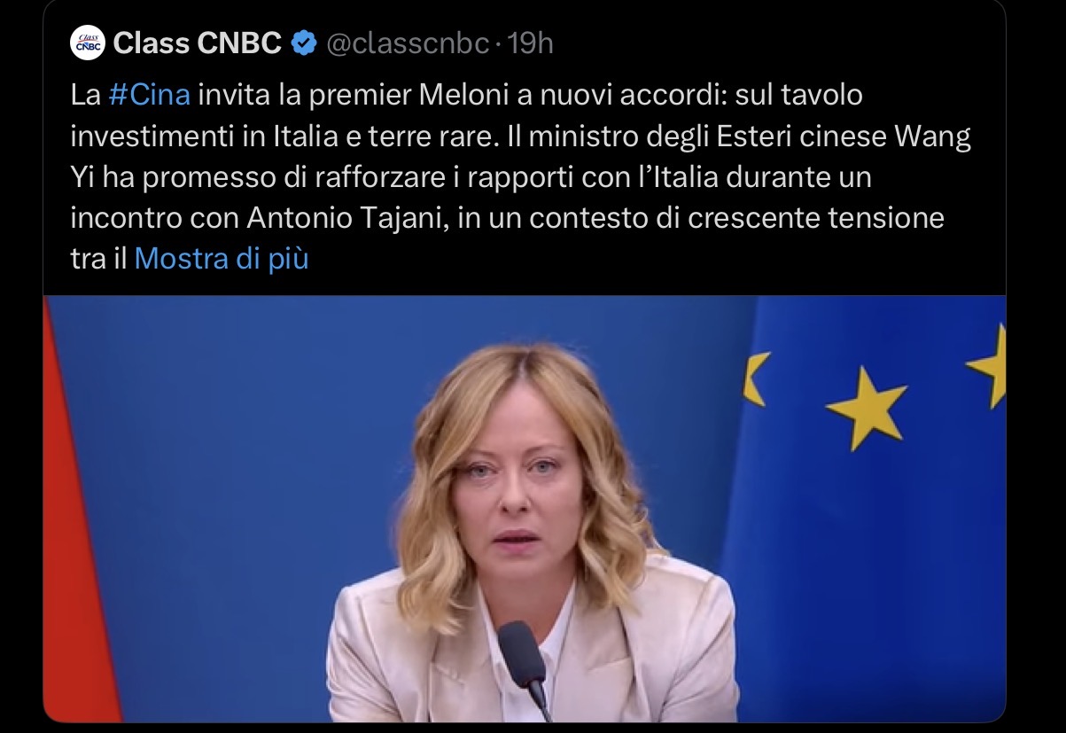 In pratica, in soldoni, tutte le bugie suppostamente filo trumpiane del governo Meloni, che in realtà aveva da tempo inondato di tasse (pressione fiscale simile a quella dei tempi di Mario Monti) e di migranti gli italiani (i 500’000 immigrati italiani prima illegali, con Meloni premier sono diventati legali, sostituzione etnica degli italiani annessa ) vengono oggi allo scoperto: terminata la coperta mediatica made in USA, dividendo dall’allineamento agli USA, basta dare una occhiata sui social per capire il livello di figuraccia mondiale che purtroppo sta emergendo sui social-media ed affini soprattutto in lingua inglese, potete verificarlo in autonomia.