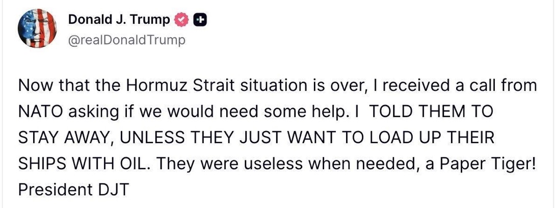 Per il resto tutto come da attese: USA, Russia e Cina, assieme all’India, faranno una Yalta corretta, non una nuova Yalta. L’Europa verra’ esclusa dagli accordi, dopo Hormuz è palese, memento che non si è voluto partecipare alla riapertura di Hormuz. Le sfere di influenza tornano col vento in poppa.