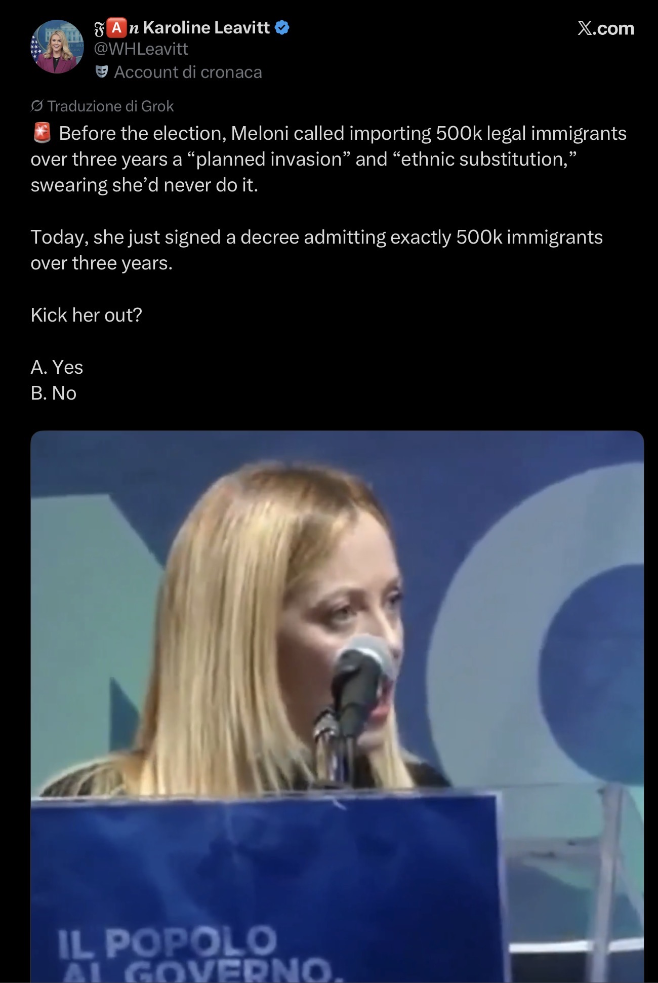 La base MAGA ha abbandonato Meloni, precisamente come fa Trump: citiamo “🚨 Prima delle elezioni, Meloni ha definito l’importazione di 500.000 immigrati legali in tre anni un'”invasione pianificata” e “sostituzione etnica”, giurando che non l’avrebbe mai fatto. Oggi, ha appena firmato un decreto che ammette esattamente 500.000 immigrati in tre anni. Cacciarla via?”